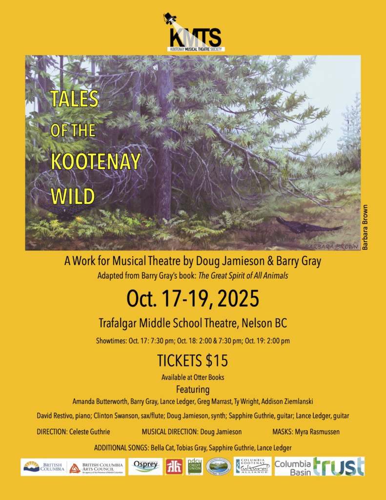 Tickets for Tales of the Kootenay Wild tickets are available at Otter Books. As an option, you can e-transfer the funds to doug@kootenaymusicaltheatre.com and the tickets will be waiting for you at the door.